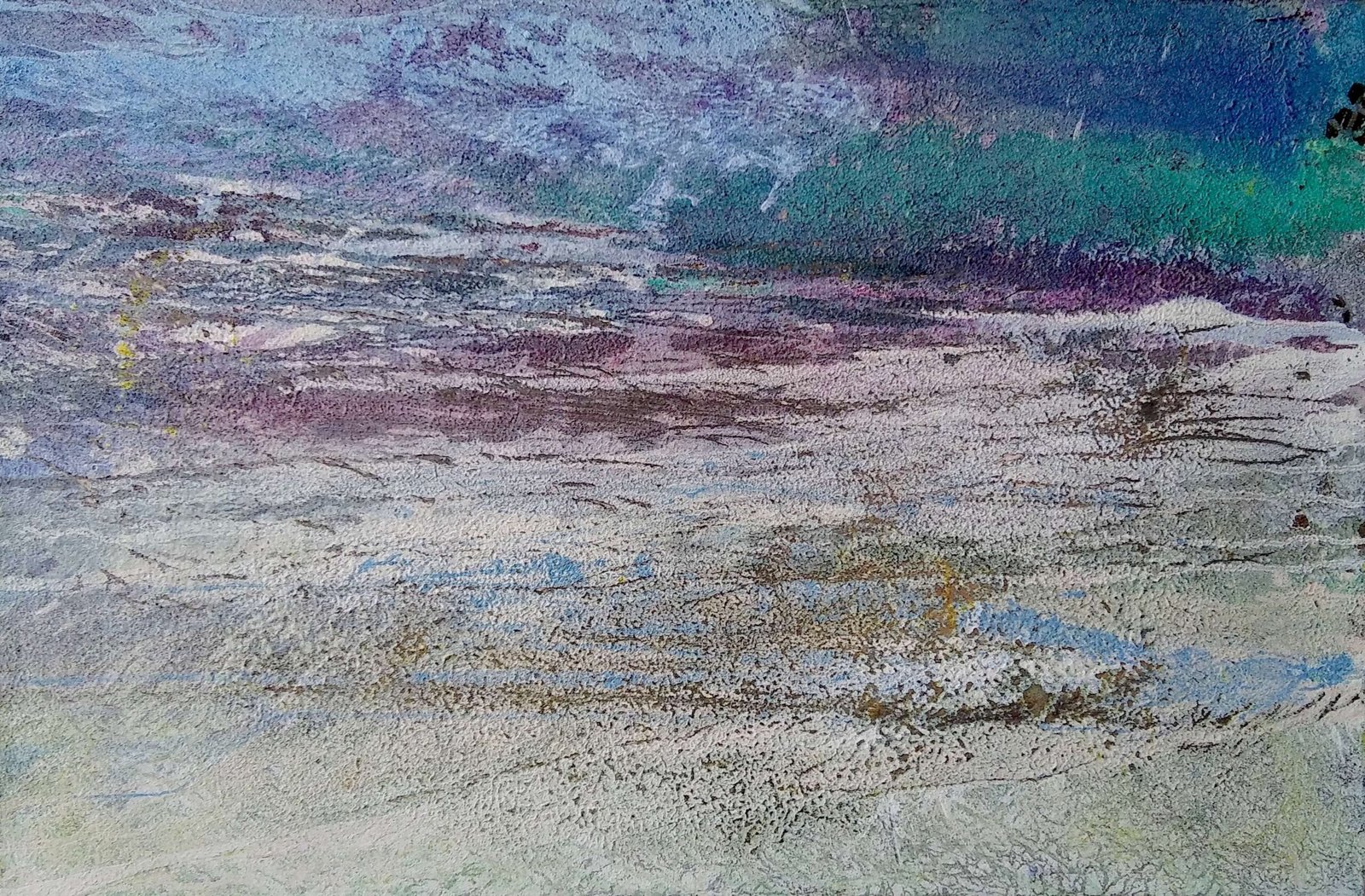 Materials: Limestone, marble, mica, copper patina, pigment, and polymer on canvas