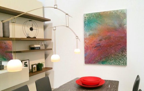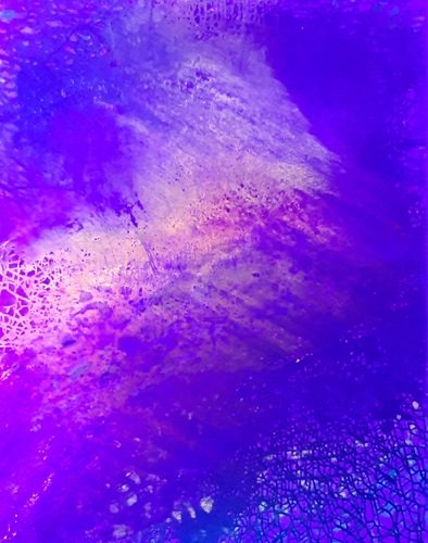 Aluminum powder, copper pigment and patina, travertine sand, uv pigment and oil on canvas