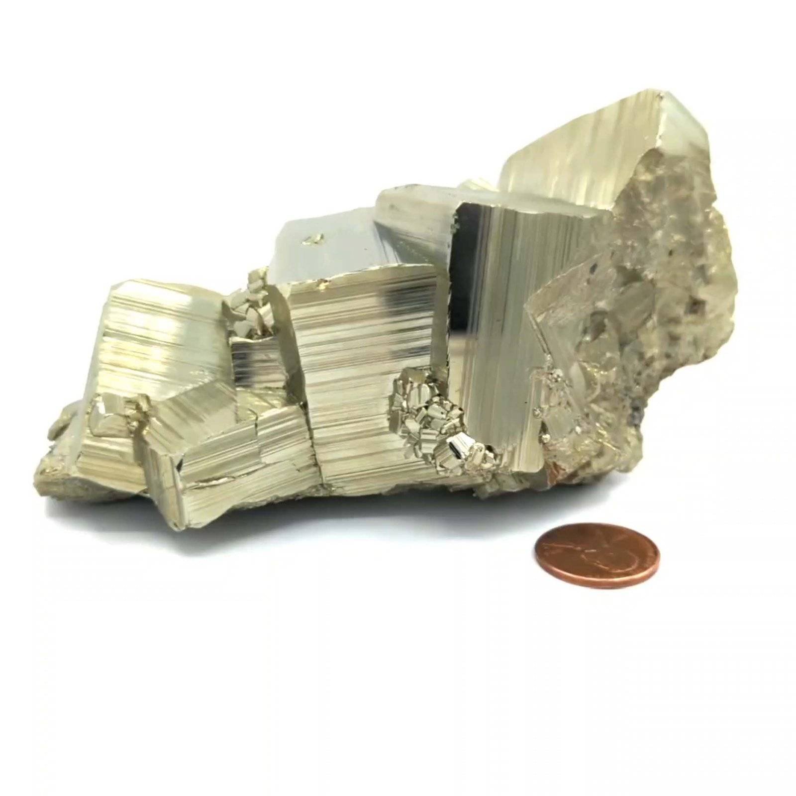 The specimen is a mineral aggregate primarily composed of pyrite (FeS2), commonly known as fool’s gold. It exhibits a metallic luster and a brassy yellow hue, characteristic of pyrite. The crystal structure is cubic, with well-defined faces and edges, displaying a combination of both cubic and octahedral forms. The surface shows striations, indicative of the crystal growth patterns. The specimen is opaque. The overall arrangement of the crystals suggests a natural formation process, typical of pyrite deposits. Origin: Machu Pichu, Peru.