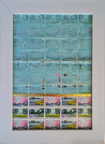 turquoise powder, gold leaf, old us stamps on panel