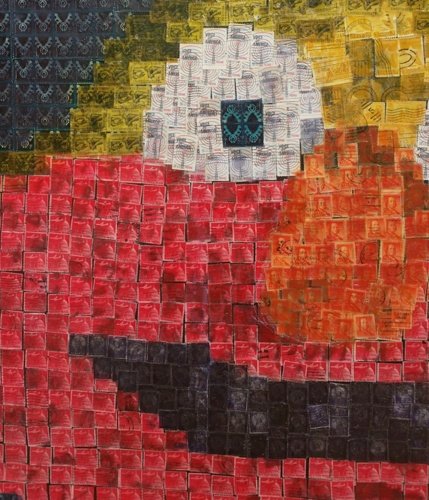 The ‘political body’ of the muppet is made from cancelled 1966 8ยข airmail stamps, depicting the DC Capitol and a plane.
