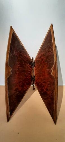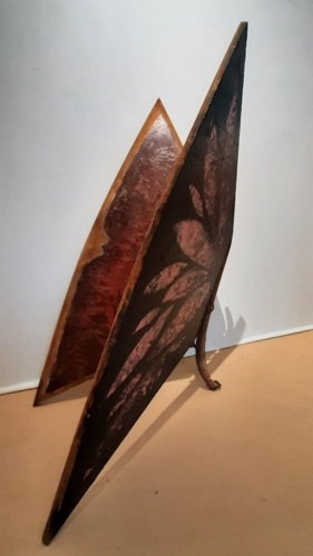 Freestanding indoor sculpture made with mixture of found objects and mixed media with metal pigments, polymer and patina on wood panels, antique brass hinges and 1880’s ironmonger tool