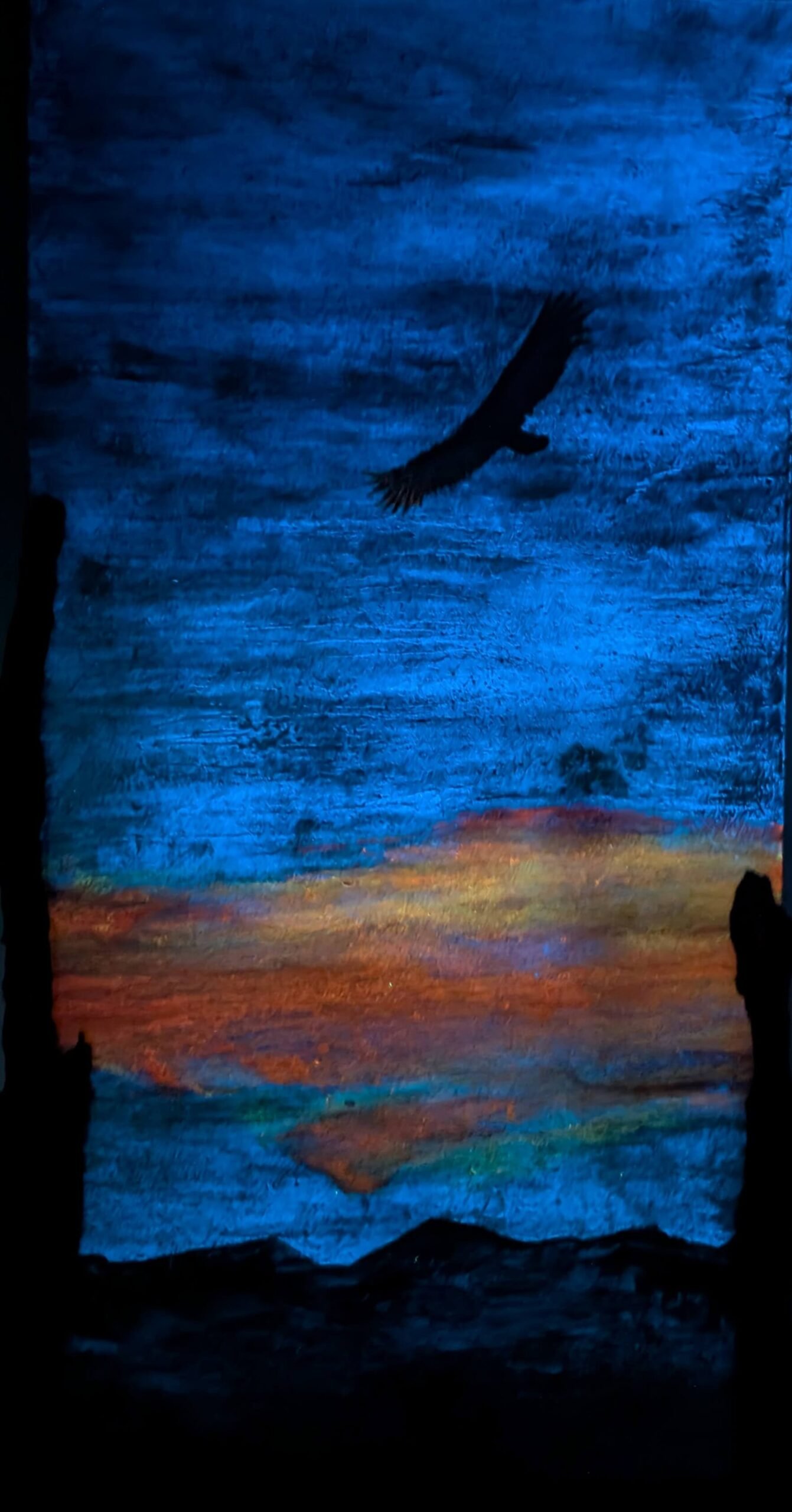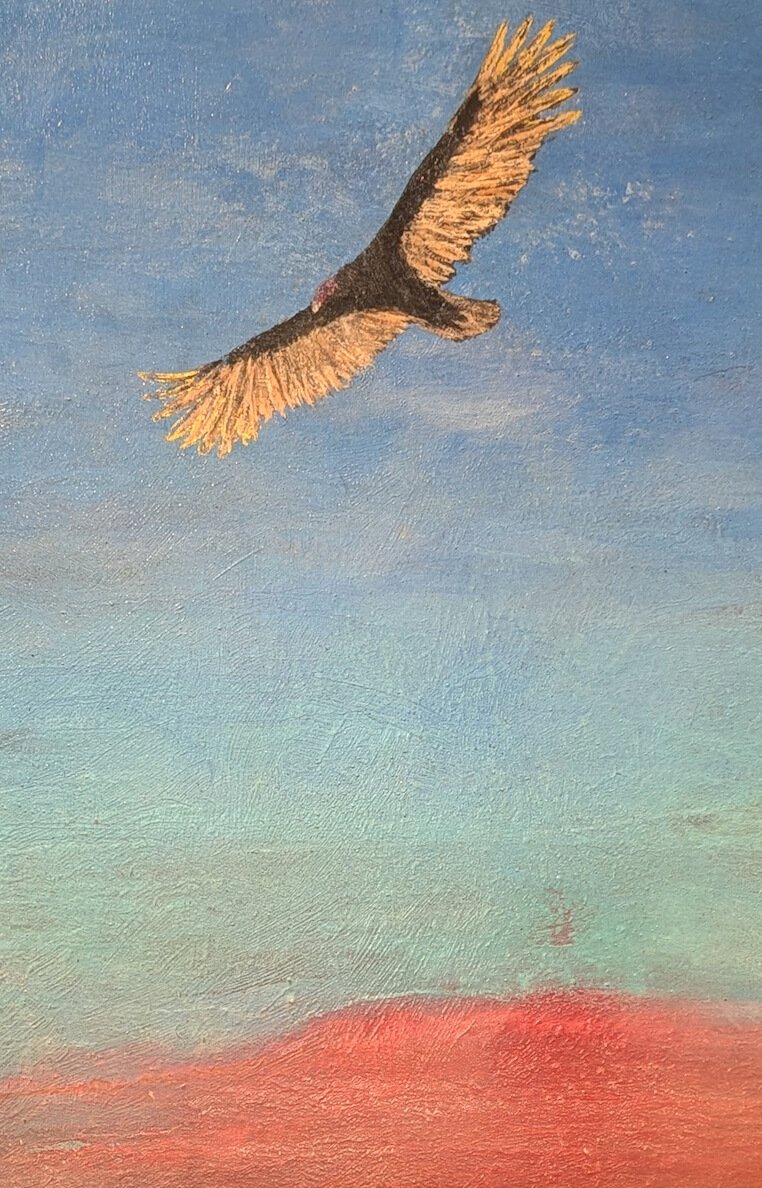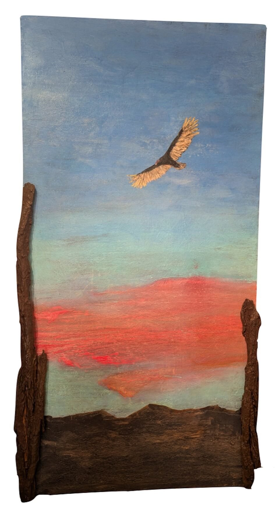 Made with turquoise powder, phosphorescent pigment, marble powder, gold leaf, iron oxide, tree bark, and polymer on canvas. This piece changes with the light, softly glowing after dark a meditation on flight, decay, and renewal. At dawn and dusk in Cerrillos, vultures circle above the cottonwoods and elms patient witnesses to the desert’s shifting light. In this piece, one glides through a glowing field of turquoise and red its wings tipped with gold, its flight suspended between day and night.