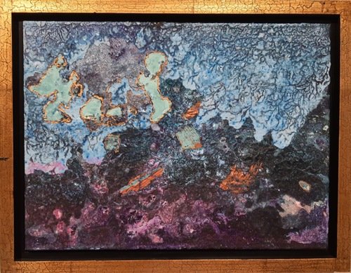 oxidized metal pigments, marble powder, mica and other mixed media on canvas