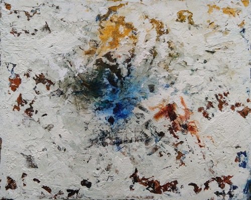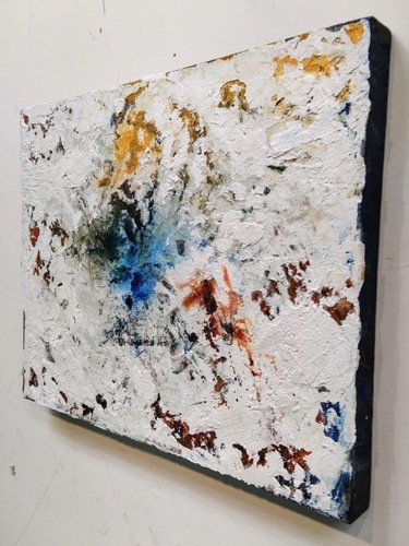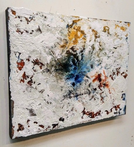 limestone, marble, pigment and polymer on 16 x 20 inch canvas, with silver crackle wood float frame