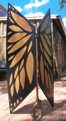 Free standing sculpture approx 5ft tall, made with mixture of found objects and mixed media with metal pigments, polymer and patina on wood panels, antique brass hinges and 1880’s ironmonger tool.