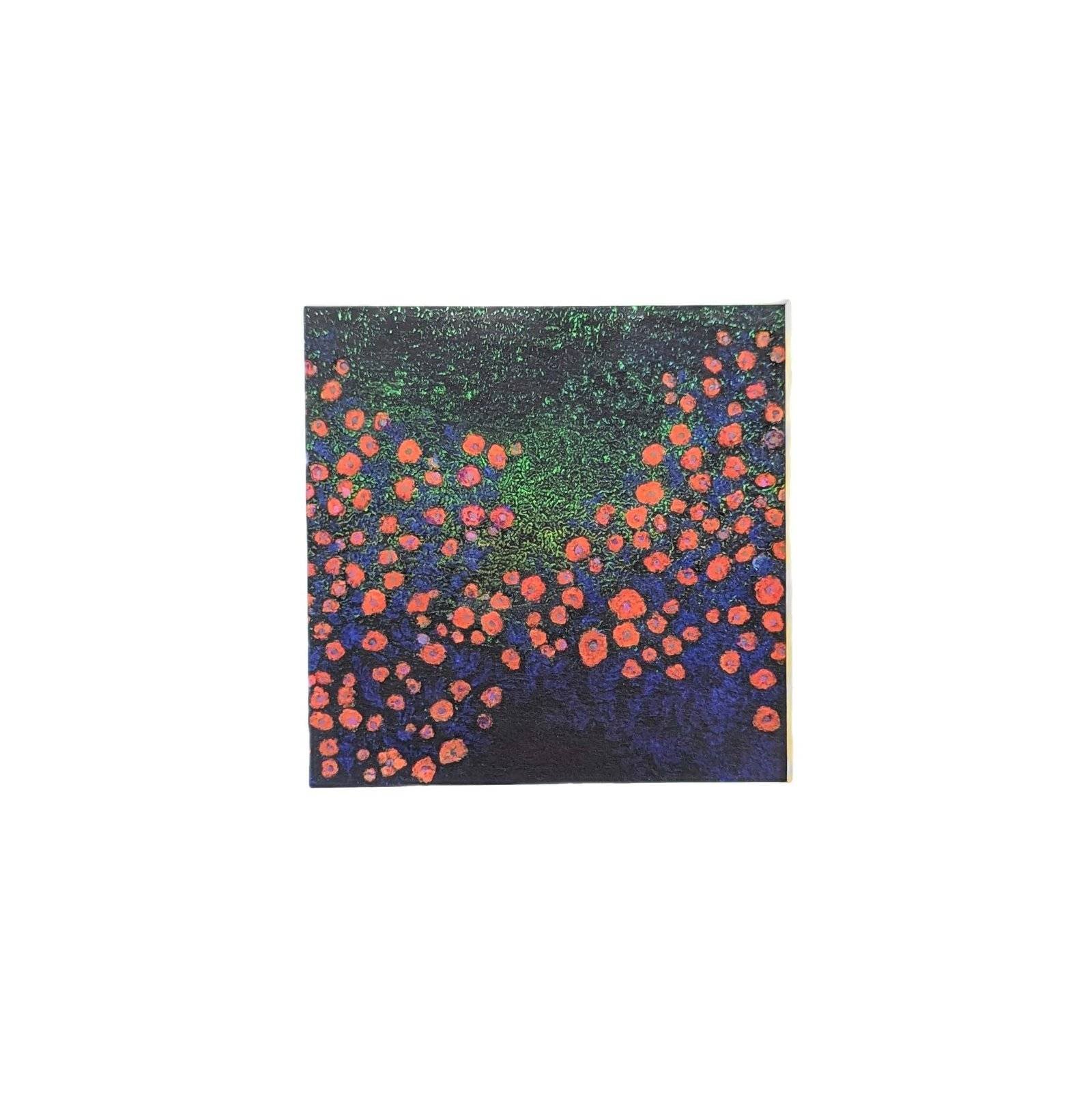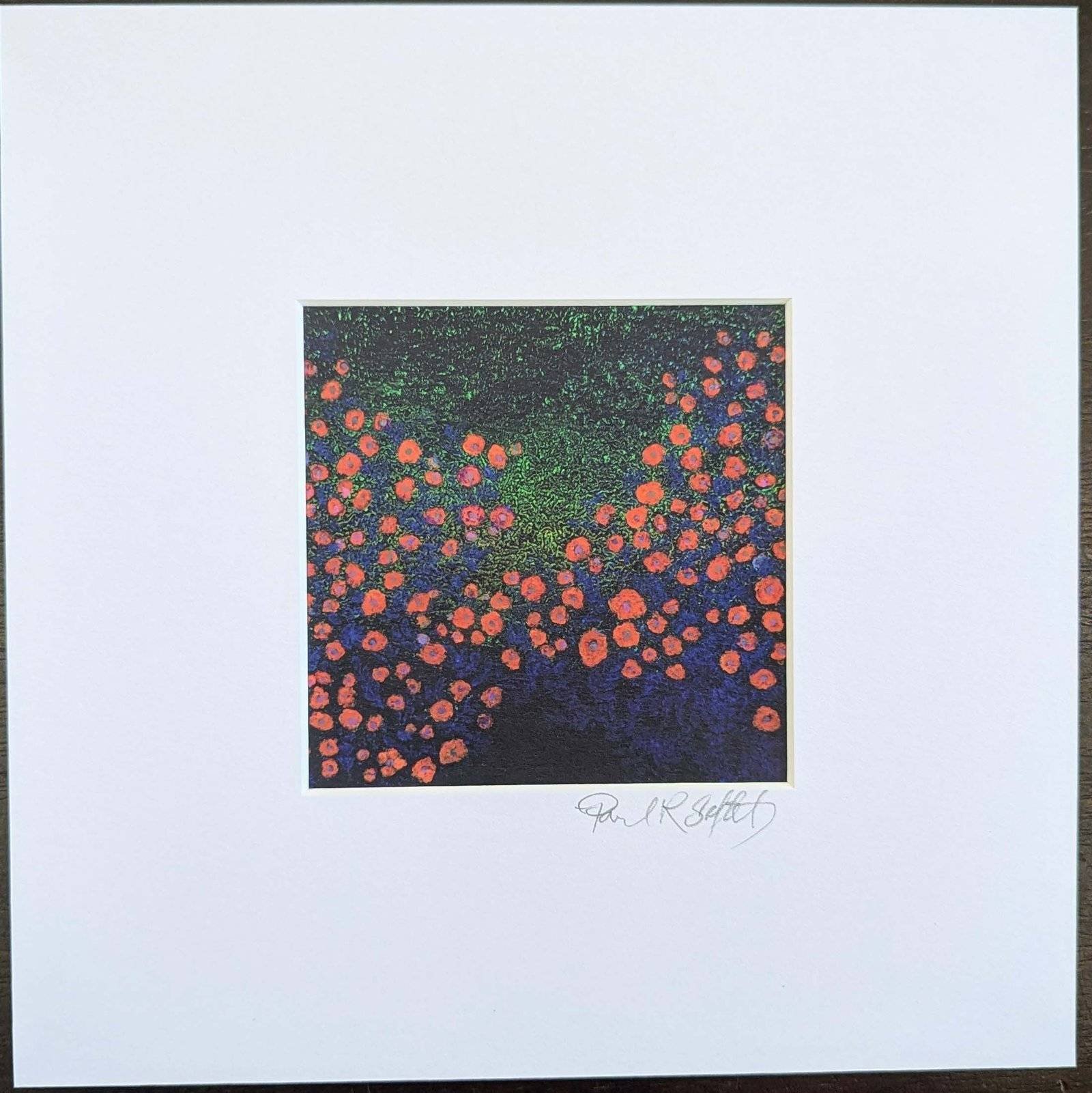 10×10″ Limited Edition matted giclee on archival card by Paul Seftel An evocative artwork on textured paper featuring a field of colorful abstract flowers under a canopy of dark foliage. The impressionistic painting is displayed within a crisp, square white matte, signed at the bottom, lending an authentic touch to this charming and unique piece.