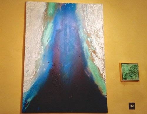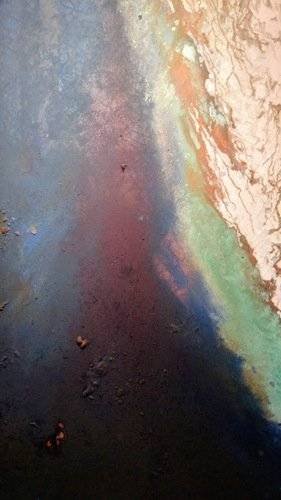 This painting incorporates, limestone, marble, copper patina, iron oxide, pigmented polymer on canvas.