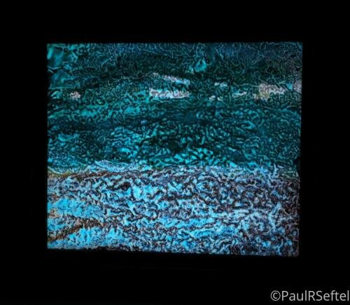 Turquoise powder, iron oxide, limestone, phosphorescent pigment and minerals on 10 x12″ panel. approx. 14.5 x 16.5″ framed. See next photo for glow in the dark, night version.