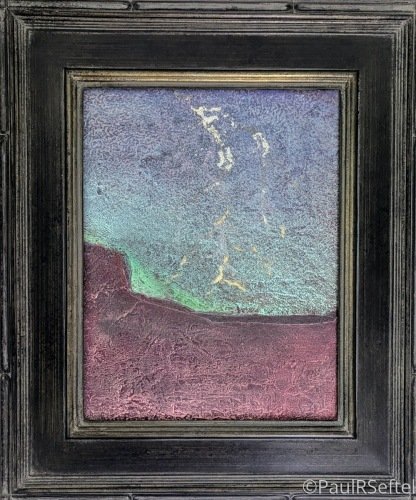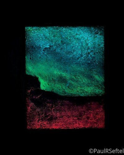 light reactive work with turquoise powder, phosphorescence, pigment and minerals with polymer on 14 x 11 inch panel in 20.5 x 17.5 Inch frame