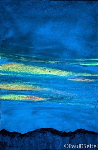 Turquoise Powder, Hematite, Marble powder, phosphorescent pigment and polymer on canvas