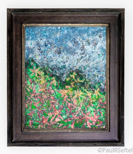 Layers of mica, phosphorescent and uv pigment, metal minerals, patina and polymer on archival panel.18×24″