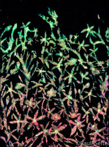 Stone and metal minerals, pigment and polymer of canvas, with UV activated glow in the dark phosphorescent pigment