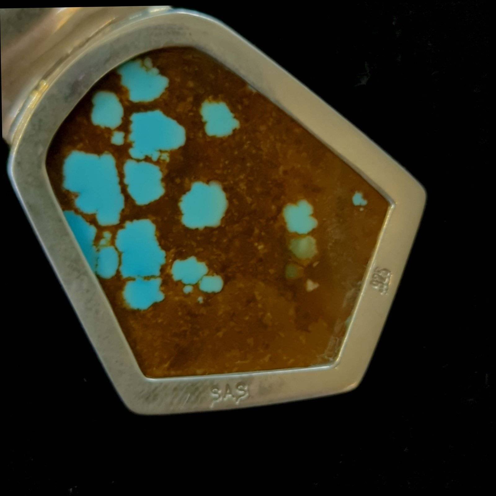 This striking silver pendant features a captivating cabochon cut turquoise gemstone, showcasing a captivating hue. The gemstone is securely set within a sterling silver frame, creating a timeless and sophisticated design. Suspended vertically, this pendant adds a touch of elegance and personality to any ensemble.