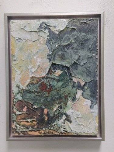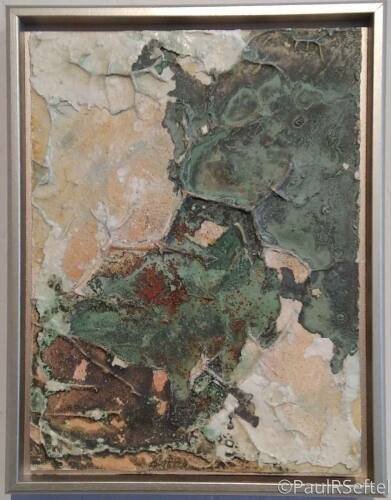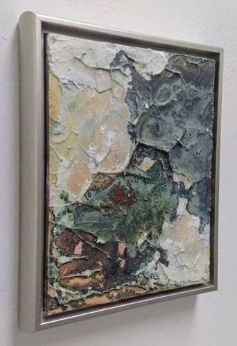 Copper patina, limestone, pigment on 9 x 12 inch panel, with silver wood float frame