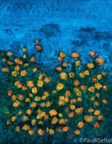 Turquoise powder, phosphorescent pigment, minerals, pigment and polymer on panel