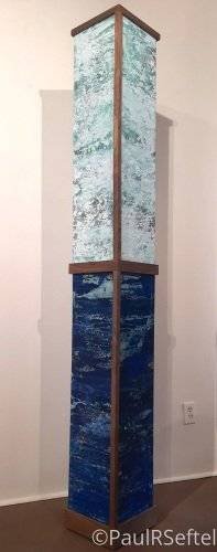 pigment and minerals on canvas in 3d walnut frame. 4 sided tower.